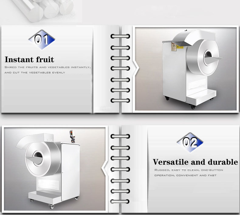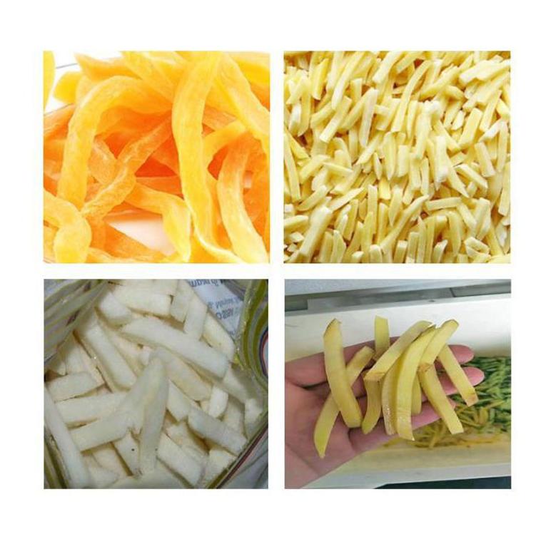 Used for bulbous vegetables and fruits such as: white radish, carrot, potato, pineapple, taro, sweet potato, melon, onion, papaya, mango, pineapple, apple and so on cut into pieces. Suitable for fruit processing plants, leisure food, supermarkets, farmers' markets, French fry processing, hotels, restaurants, etc.