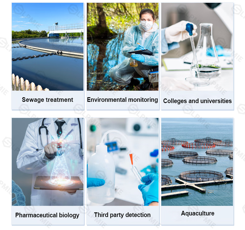 Suitable for detecting various water quality pollutants in domestic sewage, industrial wastewater, groundwater, and surface water; Applied to water quality analysis in water quality testing laboratories, municipal, sewage treatment plants, environmental monitoring stations, educational research universities, power plants, disease control centers, paper and electroplating, aquaculture, biopharmaceuticals, petrochemicals, coal, metallurgy, textiles, food and other industries.